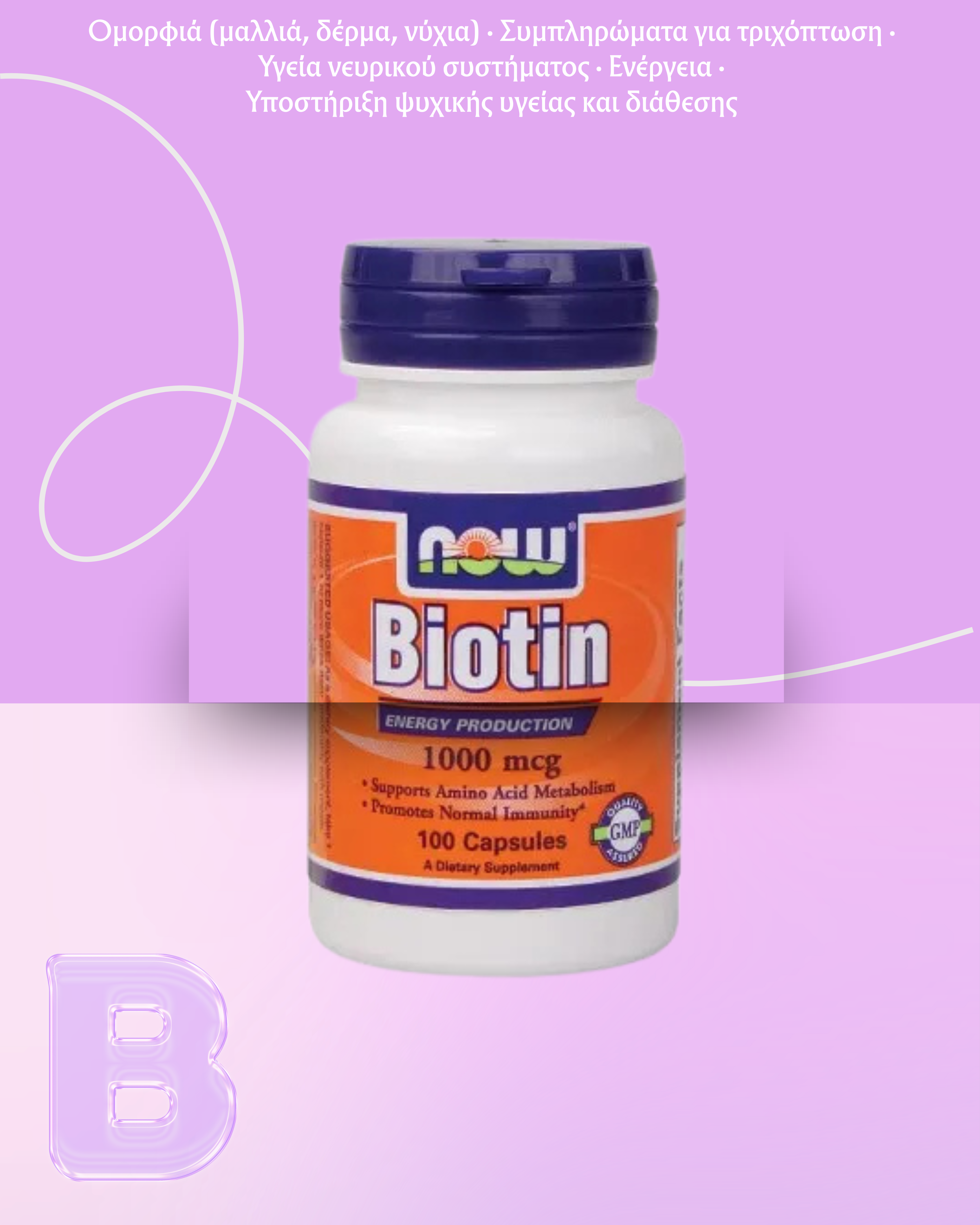 Η NOW Biotin είναι ένα συμπλήρωμα διατροφής που περιέχει βιοτίνη – μια υδατοδιαλυτή βιταμίνη που παίζει βασικό ρόλο σε πολλές μεταβολικές διεργασίες του οργανισμού. Είναι απαραίτητη για τη φυσιολογική ανάπτυξη, τη σύνθεση πρωτεϊνών καθώς και για την υγεία του δέρματος, των μαλλιών και των νυχιών.