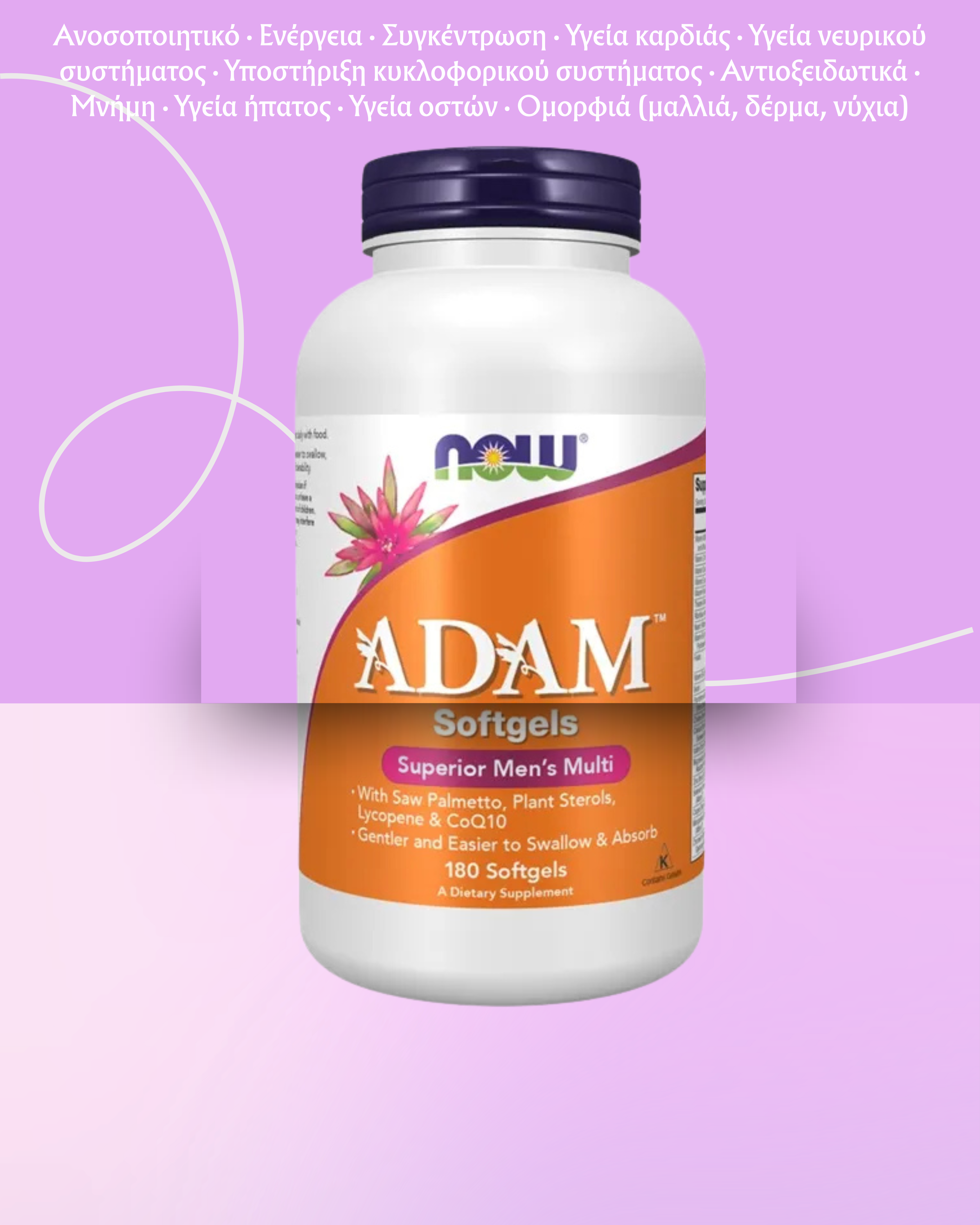 Η ADAM™ Πολυβιταμίνη για Άνδρες της NOW® είναι ένα συμπλήρωμα διατροφής ειδικά σχεδιασμένο για τις ανάγκες των ανδρών μετά την ηλικία των 40 ετών. Περιέχει πλήρες σύμπλεγμα βιταμινών, μετάλλων και ιχνοστοιχείων, καθώς και πρόσθετα συστατικά όπως το Saw Palmetto, φυτοστερόλες και συνένζυμο Q10. Η μορφή σε μαλακές κάψουλες είναι εύκολη στην κατάποση και καλύτερα ανεκτή από το πεπτικό σύστημα.