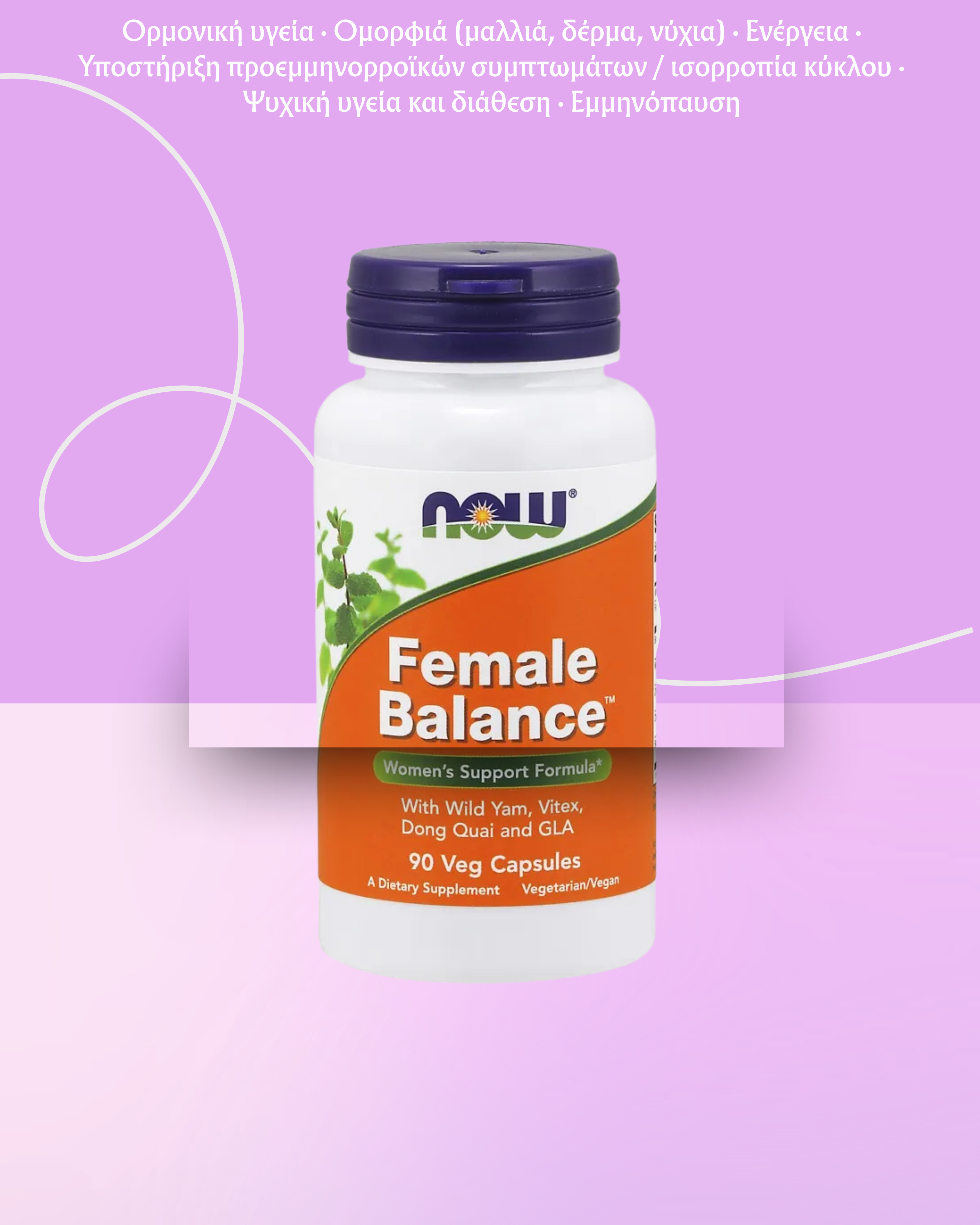 Το NOW Female Balance είναι μια μοναδική φυτική φόρμουλα που υποστηρίζει την υγεία των γυναικών. Συνδυάζει τυποποιημένα εκχυλίσματα από άγρια γλυκοπατάτα (Wild Yam) και λυγαριά (Vitex), με πρόσθετα θρεπτικά συστατικά: δόνγκ κουάι (Dong Quai), GLA, βιταμίνη B6 και φολικό οξύ, τα οποία συμβάλλουν στη φυσική ορμονική ισορροπία.